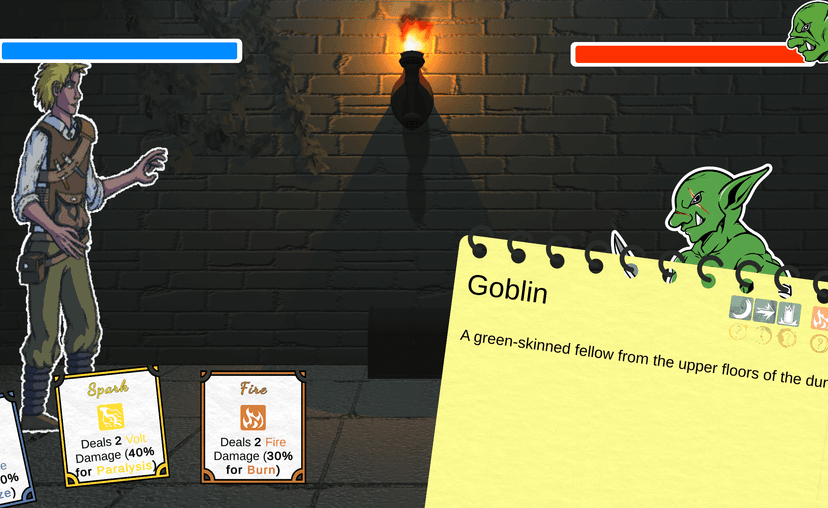 Finally, to distinguish the three elemental attacks, we decided on the last day to implement some basic status effects: Fire attacks might burn the enemy, dropping their attack power. Ice attacks could freeze them, making them more vulnerable. And Volt attacks might paralyze the enemy, for a chance to skip their turn in combat. Realistically, this was probably too ambitious for such a short time, and the status effects are quite buggy...
